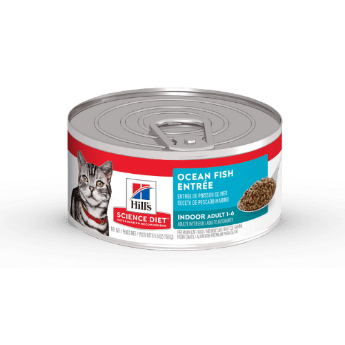 Hill’s Science Diet Adult Indoor (Ocean Fish Entrée), estofado húmedo con pescado marino real, formulado por veterinarios para gatos de interior. Con proteína magra y humedad óptima, fortalece musculatura, combate bolas de pelo con fibra vegetal, y apoya inmunidad gracias a antioxidantes (vitaminas C+E).