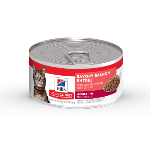 Hill’s Science Diet Adult (Savory Salmon), estofado húmedo con salmón real, formulado por veterinarios para gatos adultos. Alto en proteína, antioxidantes (vitaminas C+E) y nutrientes digestibles que mantienen masa muscular, inmunidad y una digestión saludable