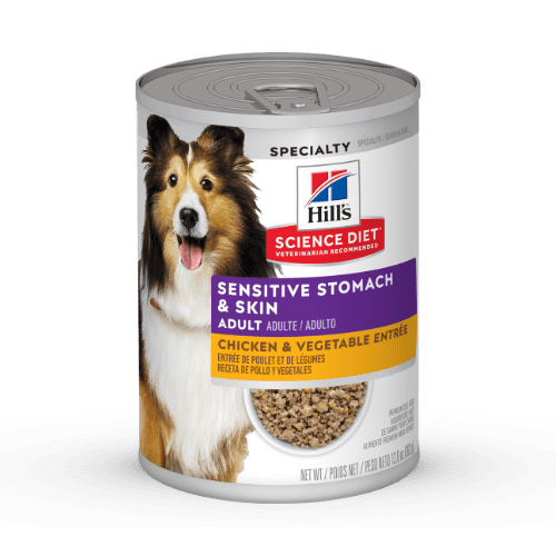Hill’s Science Diet Adult Sensitive Stomach & Skin (Chicken & Vegetable Stew), estofado húmedo con pollo, verduras y caldo, formulado por veterinarios para perros adultos con estómagos sensibles y piel delicada. Fácil digestión, prebióticos y vitamina E, además de omega‑6 para una piel nutrida y heces firmes.